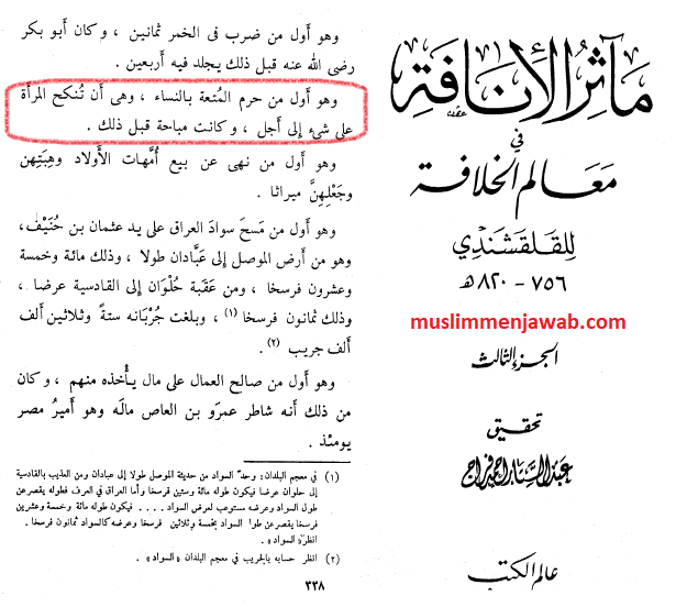 “Umar adalah orang yang pertama kali mengharamkan nikah mut’ah. Dan sebelum ia mengharamkannya, nikah mut’ah hukumnya mubah.”