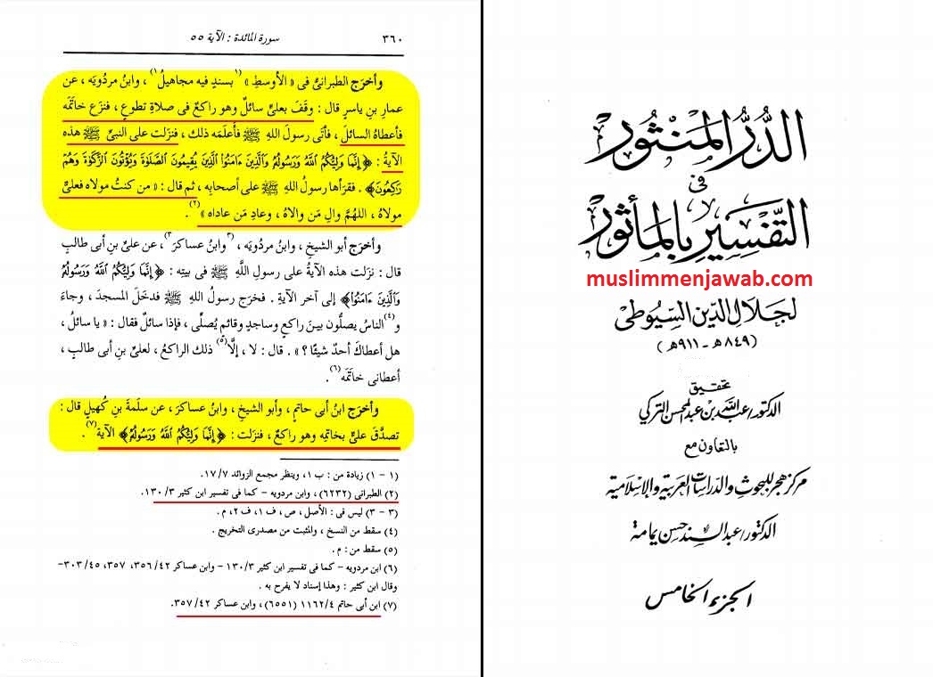 Dalam kitab Ad-Durrul mantsur fit Tafsiri bil Ma tsur atau lebih dikenal dengan tafsir As-Suyuti karya Jalaluddin As-Suyuti, ketika membahas tafsir ayat ini termaktub riwayat dari Ammar bin Yasir yang mengatakan: seorang pengemis berdiri dekat Ali yang sedang ruku dalam salatnya, lalu ia menarik cincinnya dan memberikannya pada pengemis tersebut. Ketika Rasulullah Saw mengetahui peristiwa tersebut, turun ayat ini ( إِنَّمَا وَلِيُّكُمُ اللَّهُ وَرَسُولُهُ… ) kemudian Rasulullah Saw membaca ayat tersebut pada Sahabatnya lalu berkata: Sesiapa yang aku adalah maulanya maka Ali adalah maulanya. Ya Allah sayangilah yang menyayanginya dan musuhilah yang memusuhinya.