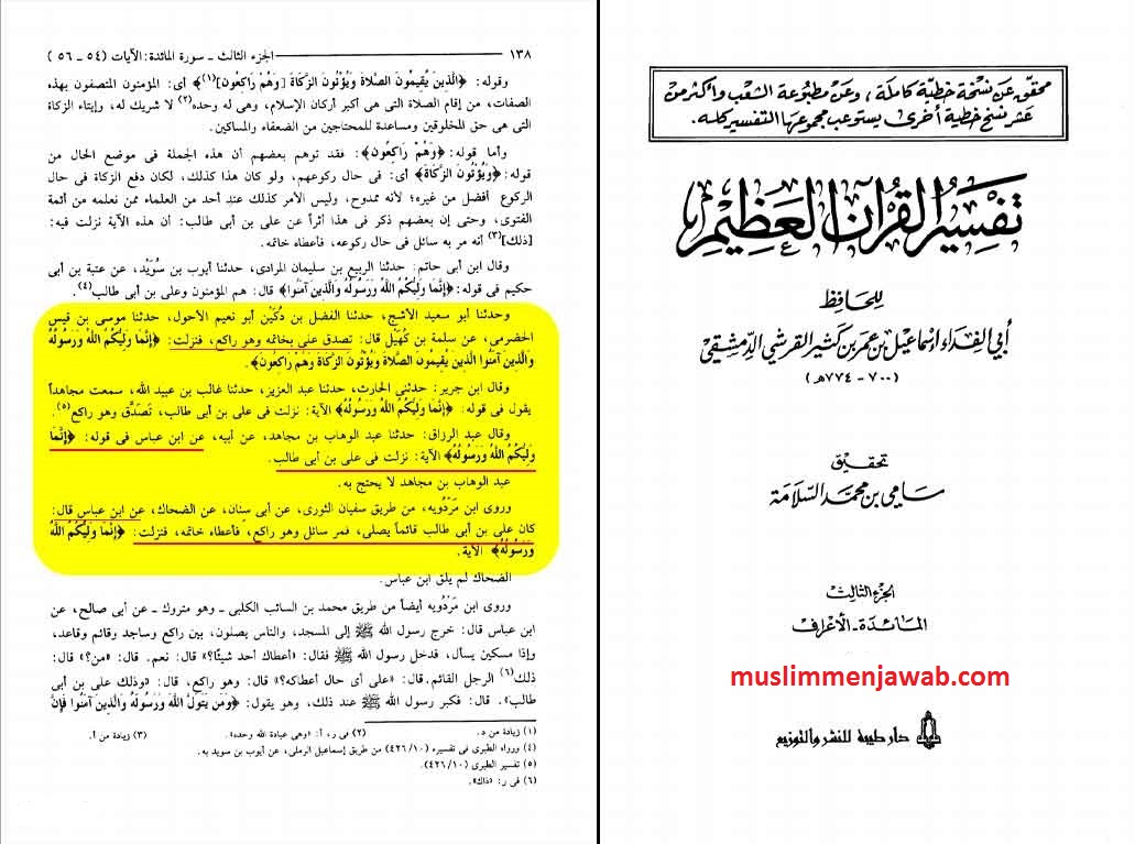Riwayat yang senada juga tercatat dalam Tafsirul Quran Al-‘Adzhim karya Ibnu Katsir. Dikatakan bahwa ayat tersebut turun berkenaan dengan Ali bin Abi Thalib pada saat ia bersedekah dengan cincinnya ketika dalam keadaan ruku.