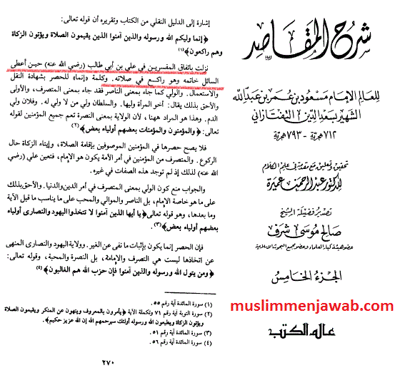 Sa’aduddin At-Taftazani dalam kitab Syarhul Maqasid juga menulis perihal tersebut dan memperkuat akan turunnya ayat ini berkenaan dengan Imam Ali AS dengan mengatakan: para Mufassir bersepakat bahwa ayat ini turun untuk Ali bin Abi Thalib RA ketika ia memberikan cincinnya untuk pengemis sedangkan ia dalam keadaan ruku dalam salatnya.