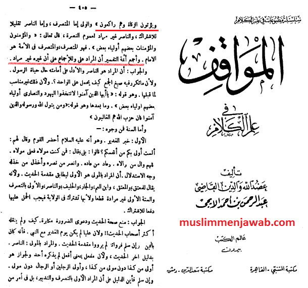 Begitu juga Abdurrahman bin Ahmad Al-Iji dalam kitab Al-Mawaqif fi ilmi Al-Kalam menulis bahwa ijma’ para imam tafsir menyebut maksud dari ayat ini berkenaan dengan Imam Ali.