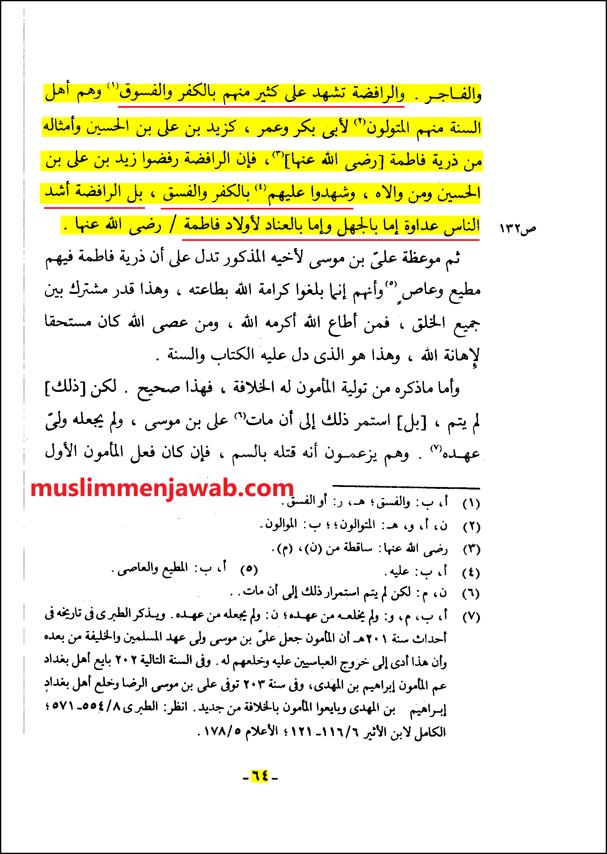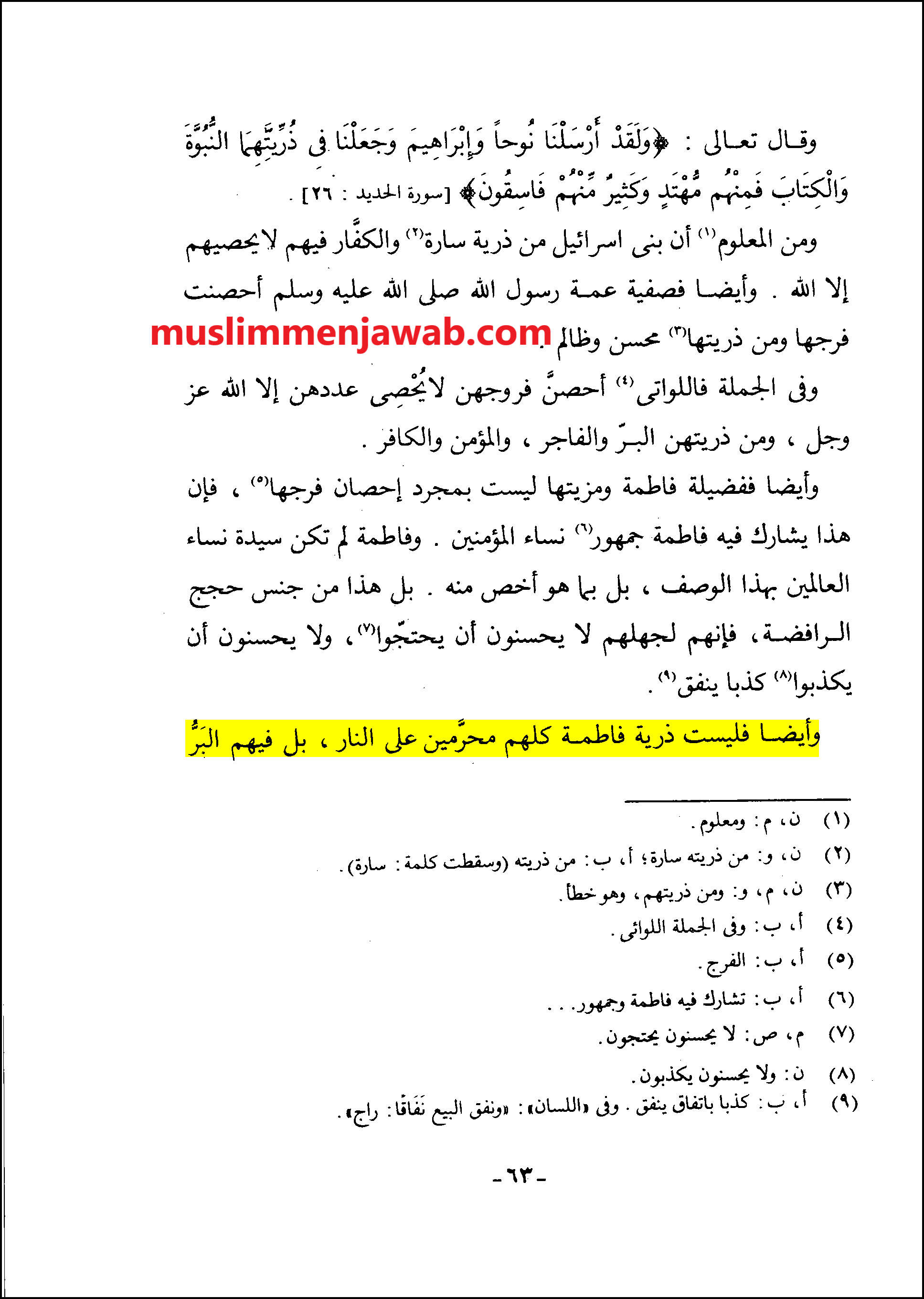 وَأَیْضًا فَلَیْسَتْ ذُرِّیَّةُ فَاطِمَةَ کُلُّهُمْ مُحَرَّمِینَ عَلَى النَّارِ، بَلْ فِیهِمُ الْبَرُّ وَالْفَاجِرُ. وَالرَّافِضَةُ تَشْهَدُ عَلَى کَثِیرٍ مِنْهُمْ بِالْکُفْرِ وَالْفُسُوقِ وَهُمْ أَهْلُ السُّنَّةِ مِنْهُمُ الْمُتَوَلُّونَ لِأَبِی بَکْرٍ وَعُمَرَ، کَزَیْدِ بْنِ عَلِیِّ بْنِ الْحُسَیْنِ وَأَمْثَالِهِ مِنْ ذُرِّیَّةِ فَاطِمَةَ [- رَضِیَ اللَّهُ عَنْهَا -] ، فَإِنَّ الرَّافِضَةَ رَفَضُوا زَیْدَ بْنَ عَلِیِّ بْنِ الْحُسَیْنِ وَمَنْ وَالَاهُ، وَشَهِدُوا عَلَیْهِمْ بِالْکُفْرِ وَالْفِسْقِ، بَلِ الرَّافِضَةُ أَشَدُّ النَّاسِ عَدَاوَةً إِمَّا بِالْجَهْلِ وَإِمَّا بِالْعِنَادِ لِأَوْلَادِ فَاطِمَةَ