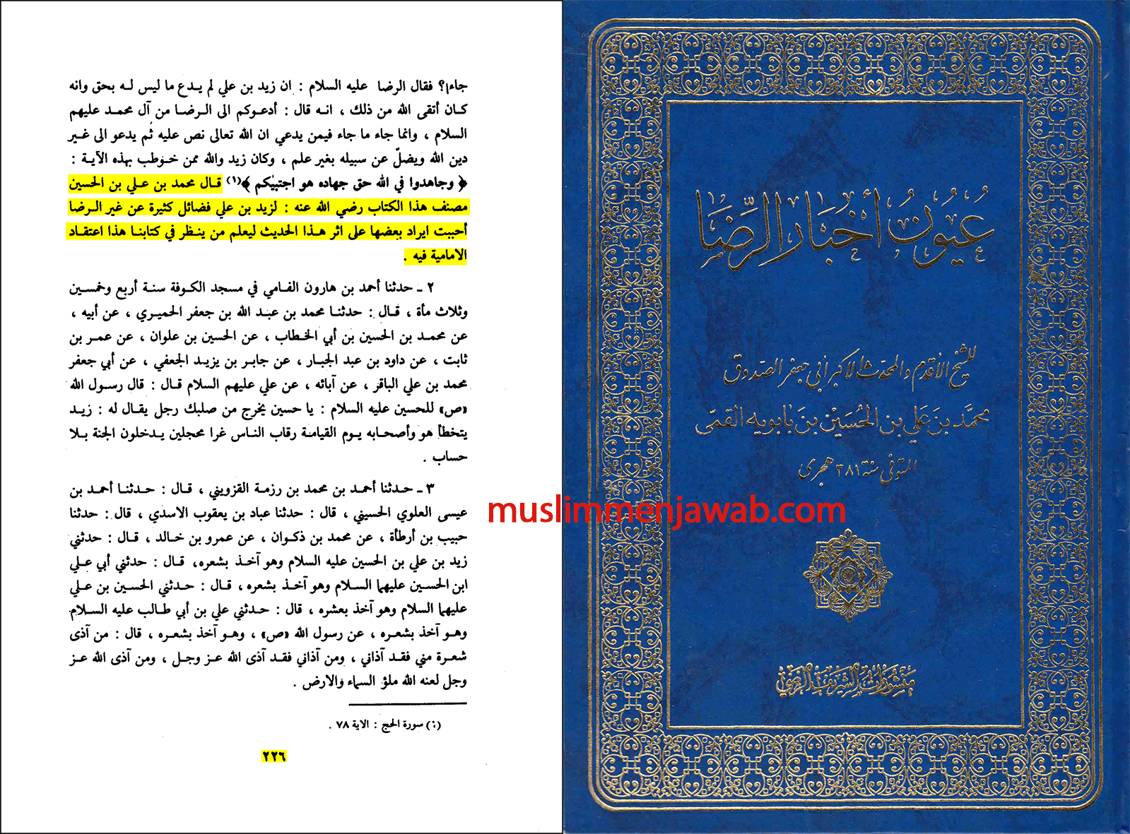 Muhammad bin Ali bin Husein (Syekh Shaduq), penulis kitab ini berkata: “Zaid bin Ali memiliki keutamaan-keutamaan yang banyak, dari selain ar-Ridha As. (Imam ke-8) aku ingin menyebutkan sebagiannya yang serupa dengan hadis ini (yang menunjukkan keutamaan Zaid) supaya orang-orang yang melihat kitab kami tahu inilah keyakinan Imamiyah terhadapnya (Zaid).[3]
