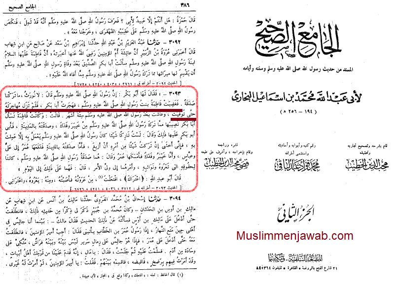 …. Maka Fathimah putri Rasulullah SAWW marah lalu ia menjauhi Abu Bakar, dan hal ini berlanjut sampai ia wafat.[1]