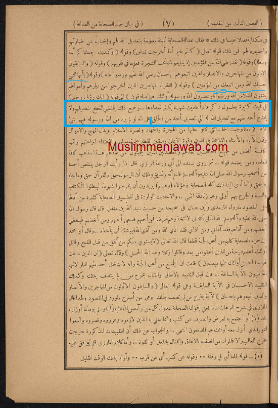 “dan di dalam ayat-ayat yang banyak, panjang jika disebutkan, Dan hadits-hadits yang masyhur yang banyak bilangannya, Dan semua itu menuntut untuk kepastian keadilan merek. Oleh karena itu tidak satu orangpun dari mereka membutuhkan penilaian dari orang lain setelah Allah sendiri yang menyebutkan karakter mereka yang adil.[1]”