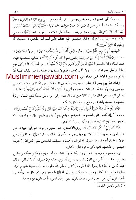 “….. dari Said bin Jubair, ia berkata: telah masuk islam bersama Nabi SAWW tiga puluh tiga orang laki-laki dan enam orang perempuan. Kemudian Umar Masuk Islam maka turunlah ayat ini.[3]”