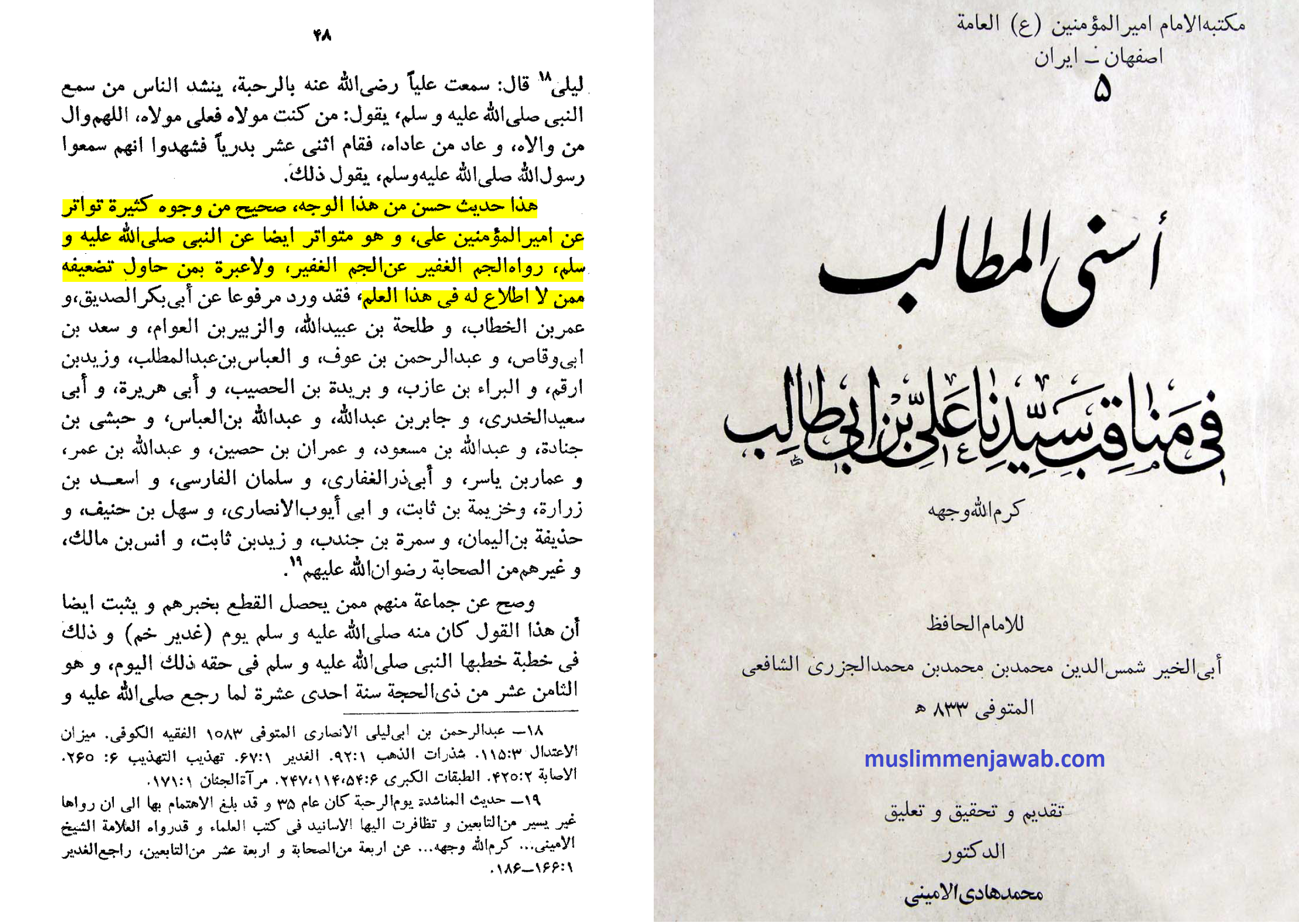 Syamsuddin Al-Jazri As-Syafi’i dalam kitabnya Asnal Matholib mengungkapkan ke shahihan dan kemutawatiran hadis Al-Ghadir. Beliau dalam kitabnya menulis: