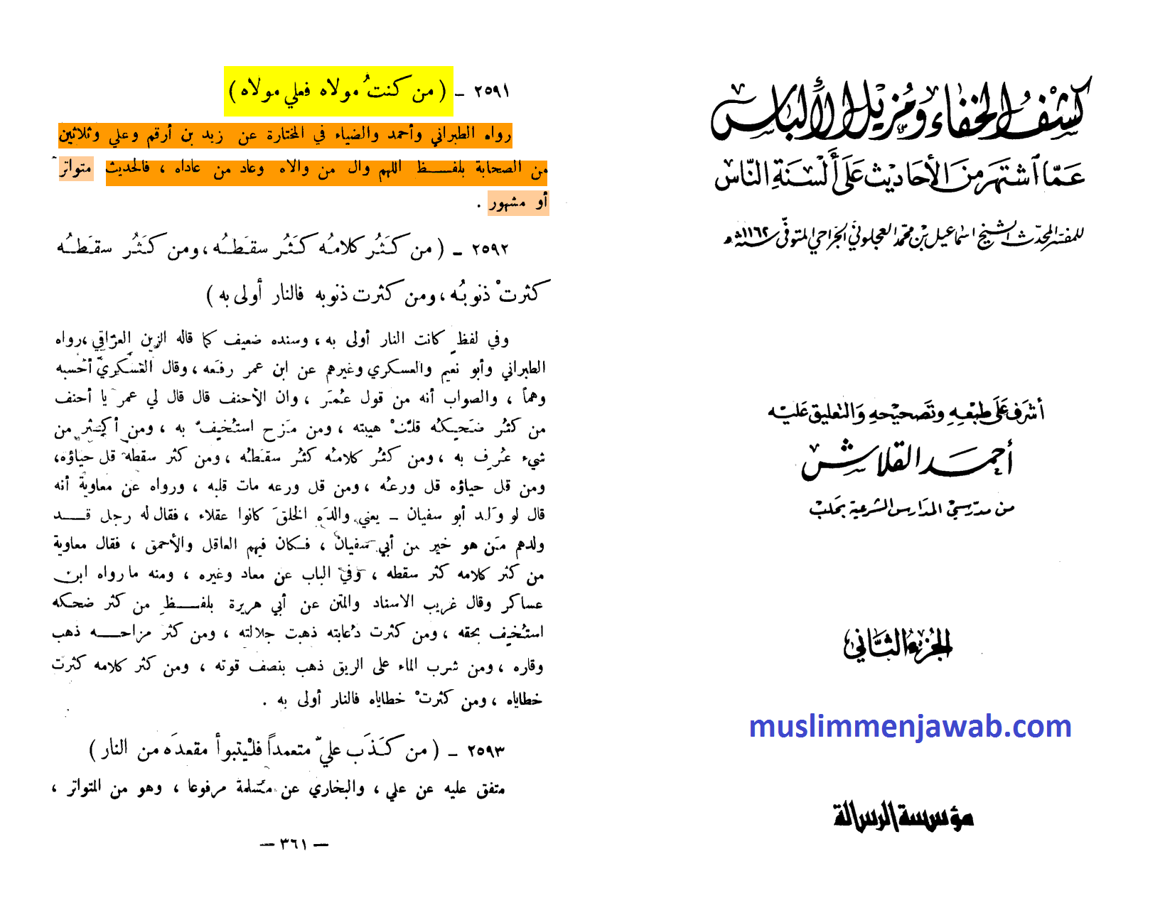 Allamah Ismail bin Muhammad Al-‘Ajaluni Al-Jarohi dalam kitabnya Kasyful Khifa wal Muzilul Albas menuliskan akan kemutawatiran hadis Al-Ghadir.