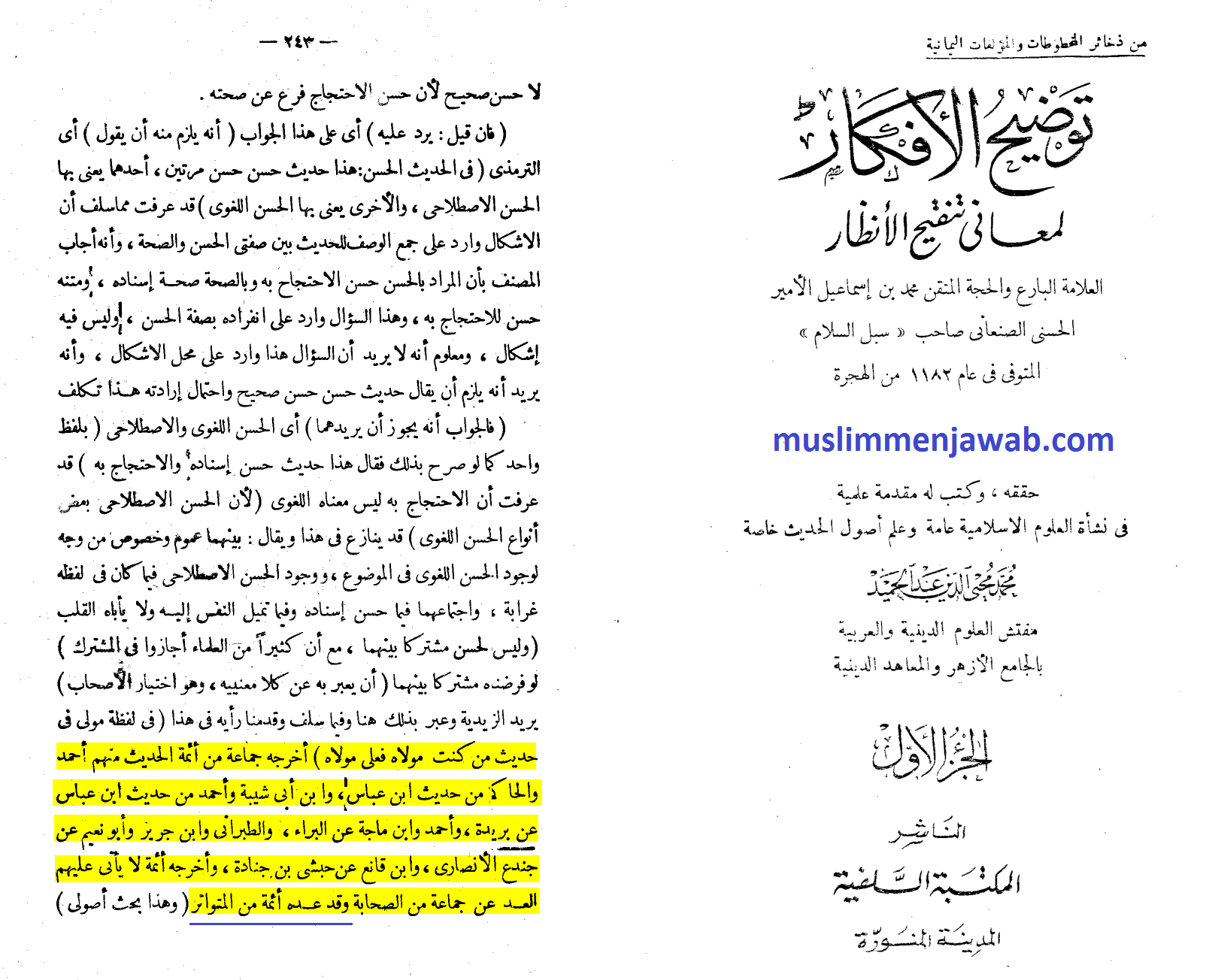 Muhammad bin Ismail As-San’ani ulama pemilik kitab Subul As-Salam juga menuliskan sesuatu tentang hadis Al-ghadir dalam kitabnya Taudhihul Afkar. Beliau mengatakan: