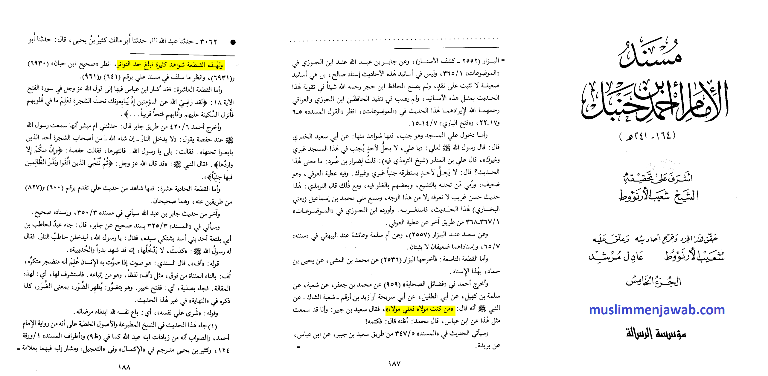 “Hadis (من کنت مولاه فعلی مولاه) para jamaah imam Hadis telah menukilnya. Diantara mereka ialah Ahmad dan Al-Hakim dari hadis Ibnu Abbas, dan Ibnu Abi Syaibah dan Ahmad dari hadis Ibnu Abbas dari Buraidah, dan Ahmad dan Ibnu Majah dari Al-Barra…… Dan para imam hadis telah memasukkan hadis tersebut kedalam hadis yang mutawatir”.