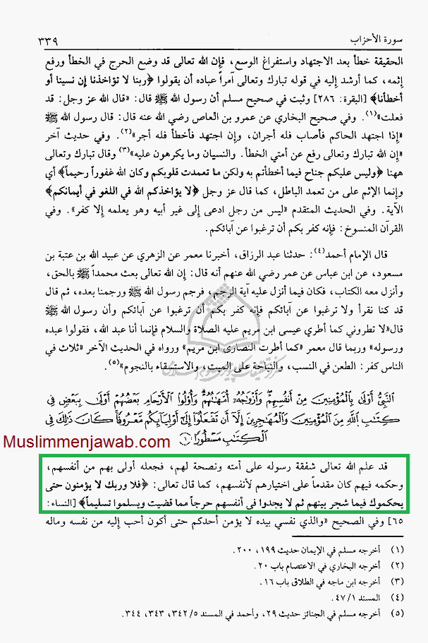 النَّبِيُّ أَوْلى بِالْمُؤْمِنينَ مِنْ أَنْفُسِهِمْ (Nabi itu lebih utama bagi orang-orang mukmin daripada diri mereka)