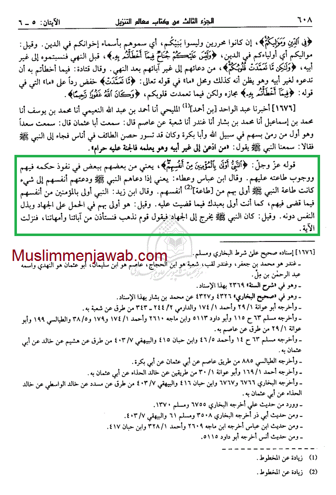 Dan Baghawi ketika menafsirkan ayat ini mengatakan: “perkataan Allah SWt (النَّبِيُّ أَوْلى بِالْمُؤْمِنينَ مِنْ أَنْفُسِهِمْ) maksudnya: dari sebagian mereka terhadap sebagian lainnya dalam hal berlakunya hukum beliau dan kewajiban mematuhinya. Dan Ibn Abbas dan ‘Atha berkata: maksudnya, jika Nabi mengajak mereka kepada sesuatu sedangkan diri mereka mengajak kepada yang lain maka mematuhi beliau lebih di utamakan dari mematuhi diri mereka. Ibn Zaid berkata: Nabi lebih utama dari mereka terhadap diri mereka sendiri, pada apa-apa yang ditetapkan nabi terhadap mereka, sebagai mana engkau lebih utama terhadap budakmu pada apa-apa yang engkau tetapkan untuknya.[3]