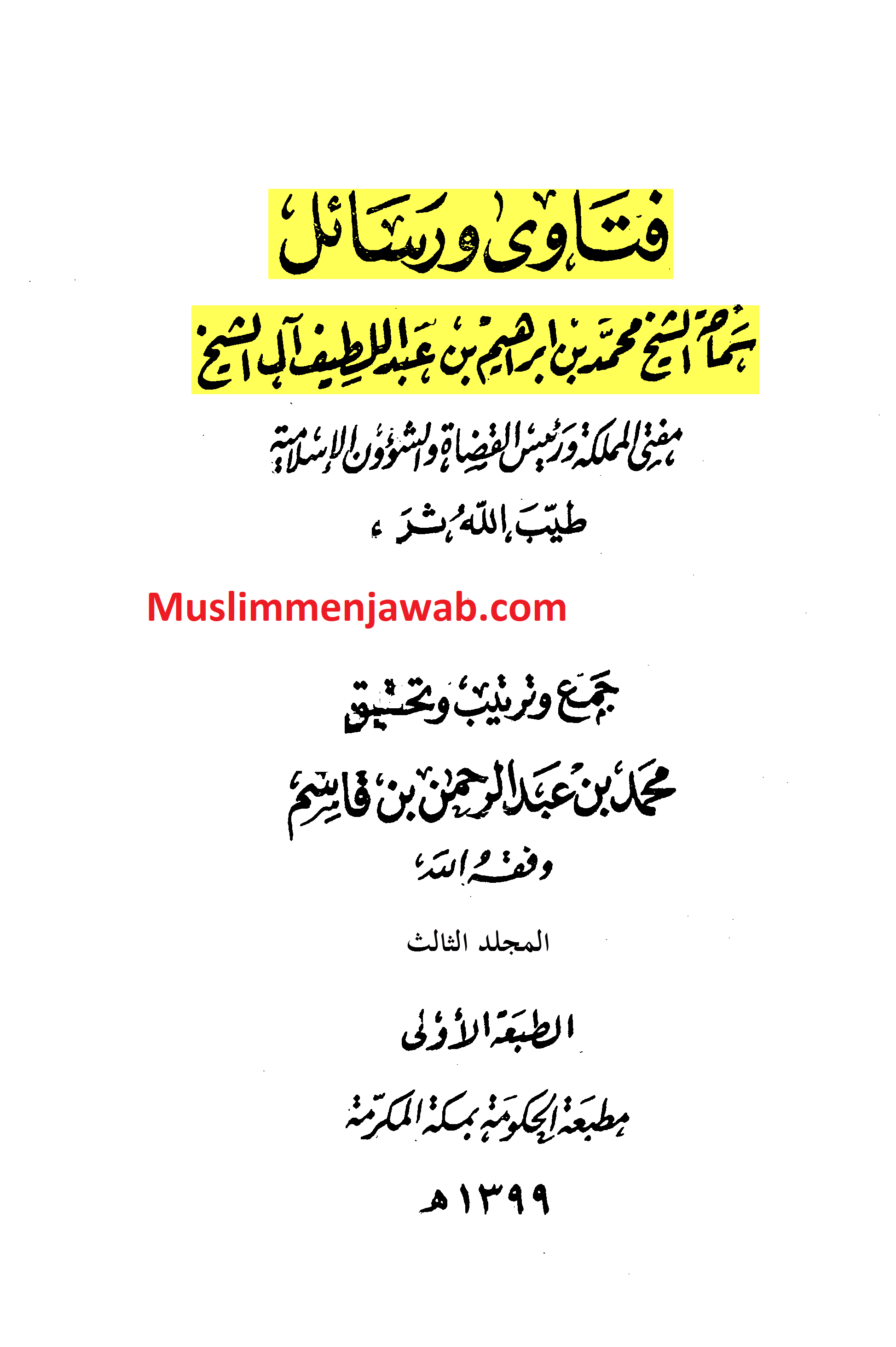 فتاوى ورسائل سماحة الشیخ محمد بن إبراهیم بن عبد اللطیف آل الشیخ،ج3،ص54 ط مطبعة الحکومة