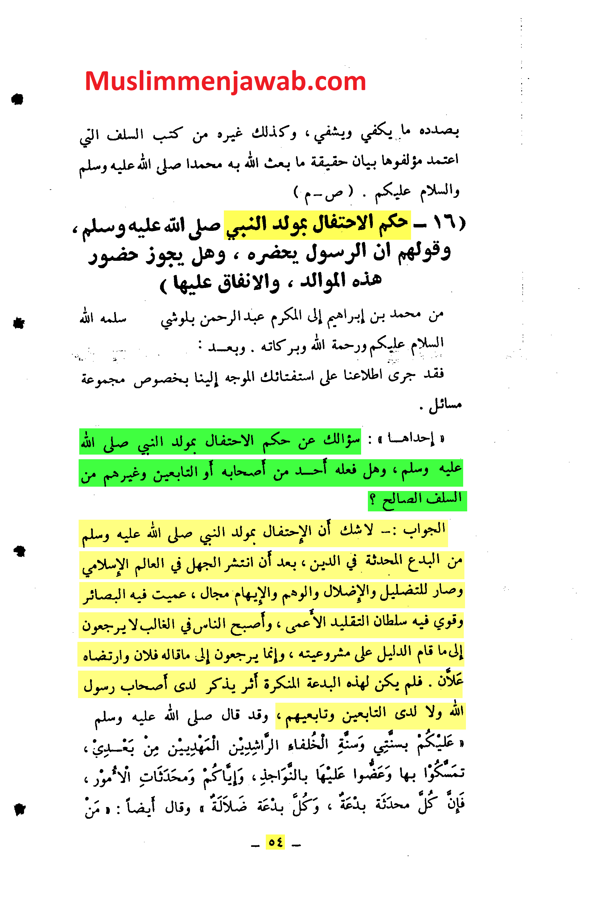 Jawab: “Tidak diragukan lagi, bahwa perayaan maulid nabi merupakan bid’ah yang baru di dalam sebuah agama, kemudian tersebarlah kebodohan di dalam dunia Islam, dan kemungkinan untuk menyesatkan dan membuat orang ragu itu telah tersedia; pandangan menjadi buta, dan taklid buta akan semakin menguat. Kebanyakan orang tidak merujuk (memastikan) bahwa maulid nabi ini dibangun di dalam syariat. Jika mereka memastikan siapa yang berkata tentang maulid dan merelakan keberadaannya, maka, dengan begitu, bid’ah yang munkar di anatara para sahabat nabi, tabiin dan pengkut tabiin tidak akan ada dampaknya.”