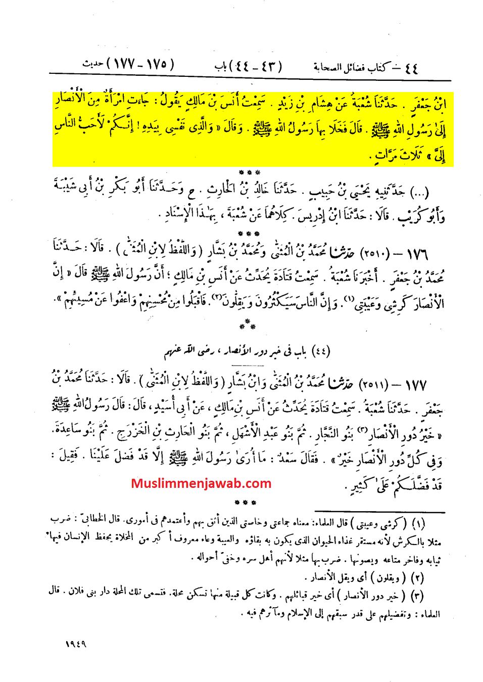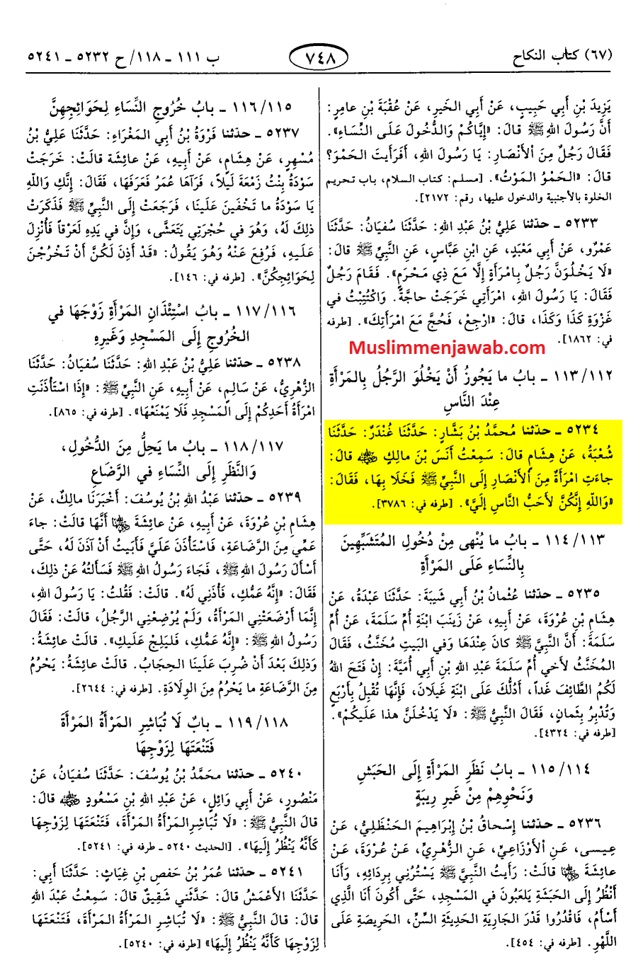 Diberitakan kepada kami dari Muhammad bin Bashar, diberitakan kepada kami dari Undzar, dan diberitakan kepada kami dari Syu’bah, dari Hisyam, dia berkata, “Aku mendengar Anas bin Malik R.A, bahwa dia berkata, ‘Seorang perempuan dari kaum Anshar mendatangi Nabi Saw. Ia pun menyepi (baca: berduaan) dengan perempuan itu dan Nabi pun berkata, ‘Demi Allah, engkau adalah perempuan tercinta bagiku.’” [1]
