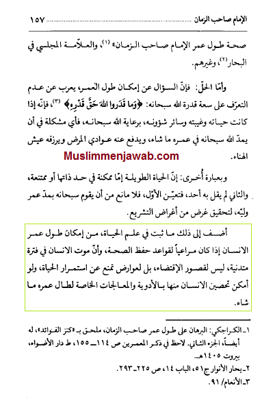 Dari kedua penjelasan di atas dapat dipahami bahwa umur panjang yang dimiliki oleh Imam Mahdi As, tidaklah menjadi persoalan jika hal itu dikehendaki oleh Allah Swt. karena sains dan ilmu penegtahuan tidak melihat hal itu sebagai suatu persoalan yang mustahil terjadi.