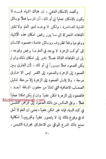 “Arti dari kemungkinan ilmiah adalah bahwa sekalipun secara praktis dengan sarana yang ada dewasa ini tidak mungkin bagi Anda dan saya untuk melakukan sesuatu, akan tetapi ilmu pengetahuan yang selalu mengalami perkembangan, tidak melihat adanya alasan untuk menolak kemungkinan atau terjadinya dalam kondisi dan situasi tertentu. Mengenai manusia yang pergi ke planet Venus umpamanya, tidak ada dalam sains yang membatalkan kemungkinannya. Bahkan argumen dan diskusi yang ada saat ini menunjukkan kemungkinannya, meskipun hal ini tidak mungkin bagi saya atau Anda saat ini. Karena apa yang membuat perbedaan antara pergi ke Venus dan pergi ke bulan tidak lain adalah jarak. Dan tidak ada perbedaan di antara itu, kecuali bahwa itu lebih sulit dan membutuhkan lebih banyak usaha. Dan itu karena Venus lebih jauh dari bulan, jadi naik ke Venus secara ilmiah mungkin, meskipun dalam praktiknya, pada saat ini, itu tidak mungkin.[1]