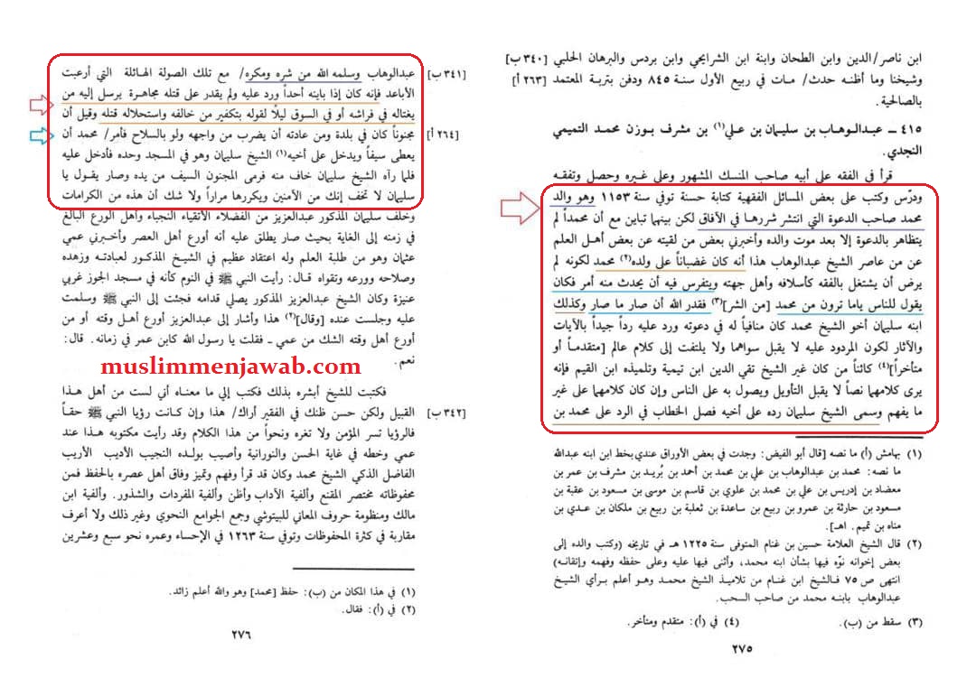 Dan dia adalah ayah dari Muhammad pemilik dakwah yang api kejahatannya melanda dunia. Tapi diantara keduanya terdapat perbedaan dimana Muhammad tidak menampakkan dakwahnya kecuali setelah kematian ayahnya. Beberapa orang yang menemuinya dan juga dari ahli ilmu juga dari yang sezaman dengan syaikh Abdul Wahhab (ayah Muhammad bin Abdul Wahhab) mengabarkan padaku bahwa ia marah pada anaknya Muhammad, karena ia tidak suka anaknya sibuk dengan pelajaran fikih seperti para pendahulunya dan orang-orang di sekitarnya, karena ia faham akan terjadi sesuatu padanya, sehingga ia mengatakan pada orang-orang: kalian akan segera melihat kejahatan dari Muhammad, maka Allah telah menetapkan apa yang terjadi terjadilah. Begitu juga putranya Sulaiman yang merupakan saudara dari Muhammad. Ia mengkritik dakwahnya dengan ayat dan riwayat karena ia tahu saudaranya tersebut tidak menerima kecuali hanya ayat dan riwayat, dan ia (Muhammad) tidak memperhatikan perkataan ulama yang dulu ataupun sekarang kecuali Syaikh Taqiyuddin Ibn Taymiyah dan muridnya Ibnul Qayyim, karena ia melihat perkataan mereka berdua seperti Nash yang tidak menerima takwil, dan ia menyerang orang-orang dengan perkataan mereka berdua, meskipun perktaan tersebut bertentangan dengan apa yang difahami. Syaikh Sulaiman menamakan (buku) yang mengkritik saudaranya tersebut dengan “Fashlul Khitab fi Ar-Rad ‘ala Muhammad bin Abdul Wahhab”.