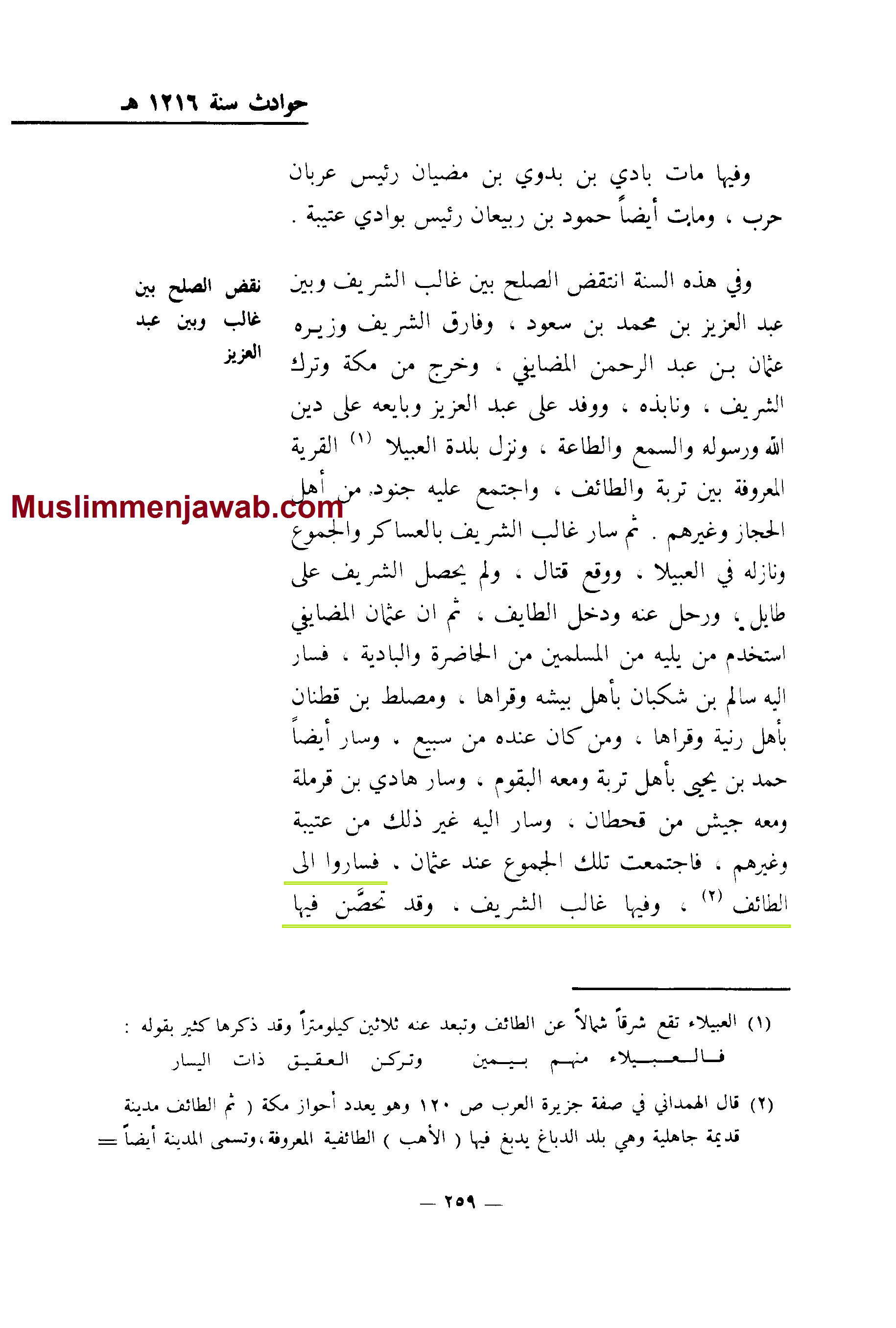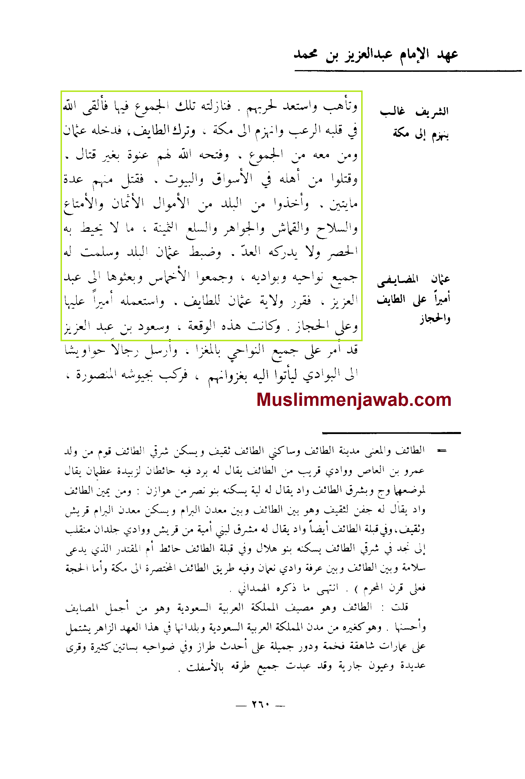 “Lalu mereka (Utsman bin Abdurrahman dan para pendukungnya) berangkat menuju Thaif, sementara di sana sudah ada Ghalib al-Syarif yang menjadikan kota tersebut sebagai tempat berlindung seraya melakukan persiapan untuk memerangi mereka. Setelah itu kelompok tersebut memeranginya di sana. Allah menjadikan rasa takut di dalam hatinya yang menyebabkannya meninggalkan Thaif dan melarikan diri ke Makkah. Utsman dan pasukannya kemudian memasuki Thaif serta menaklukkannya dengan kekerasan tanpa peperangan. Mereka membunuh penduduknya di pasar dan rumah-rumah mereka. Jumlah yang terbunuh ketika itu sekitar dua ratusan orang. Meraka merampas barang berharga, harta benda, senjata, kain, perhiasan dan komoditas mahal dari penduduknya. Utsman mengambil alih kekuasaan negri tersebut lalu diserahkan kepadanya kawasan sekitarnya. Mereka mengumpulkan Khumus kemudian diserahkan kepada Abdul Aziz. Lantas Abdul Aziz mengukuhkan Utsman sebagai penguasa Thaif serta menjadikannya amir daerah tersebut dan Hijaz.[1]”