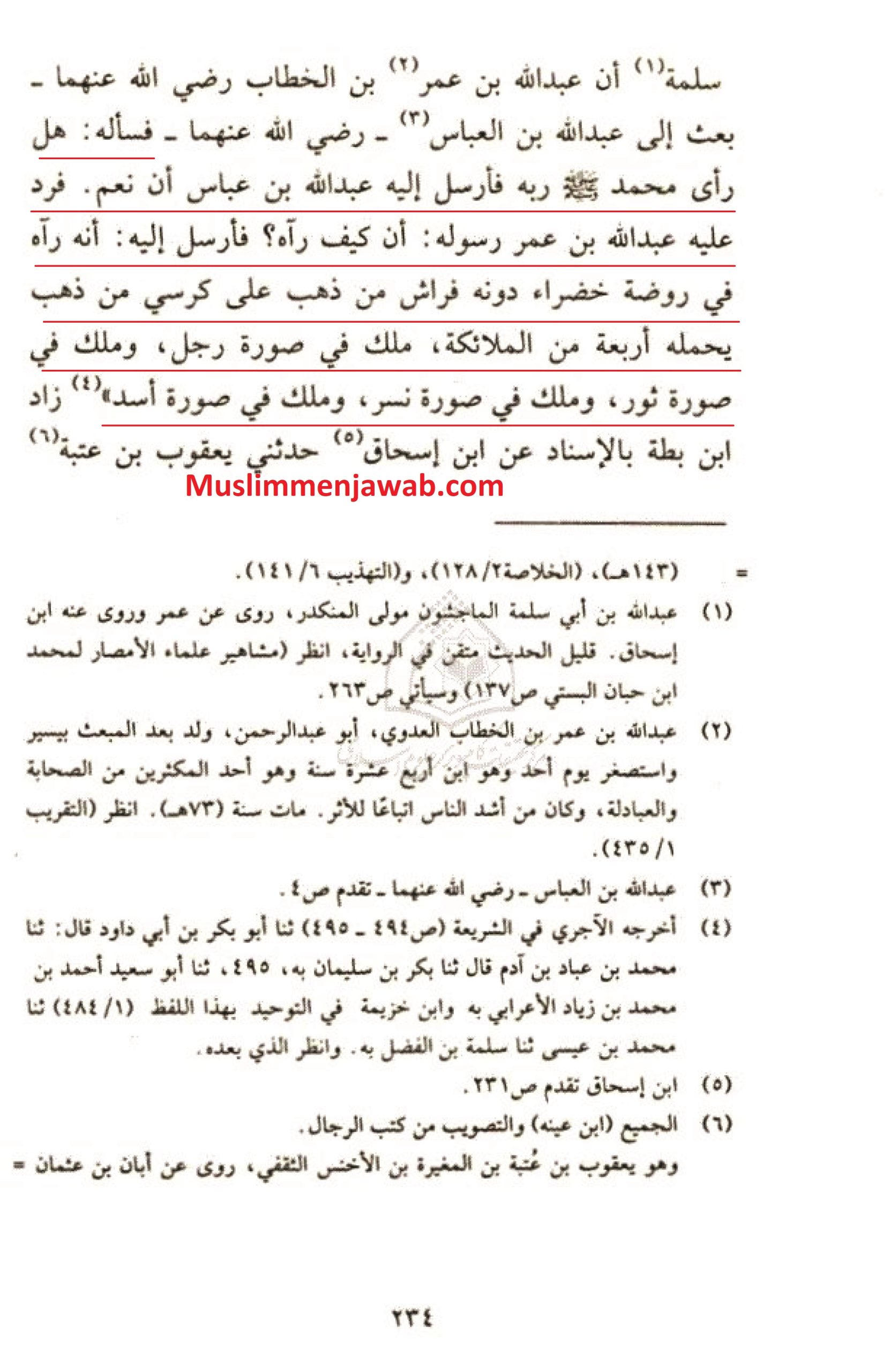 هل رأي محمد ربه؟ فأرسل إليه عبدالله بن عباس أن نعم، فردّ عليه عبدالله بن عمر رسوله أن كيف رآه؟ فأرسل انه رآه في روضة خضراء، دونه فراش من ذهب علي كرسي من ذهب، يحمله أربعة من الملائكة، ملك في صورة رجل و ملك في صورة ثور و ملك في صورة نسر و ملك في صورة أسد.
