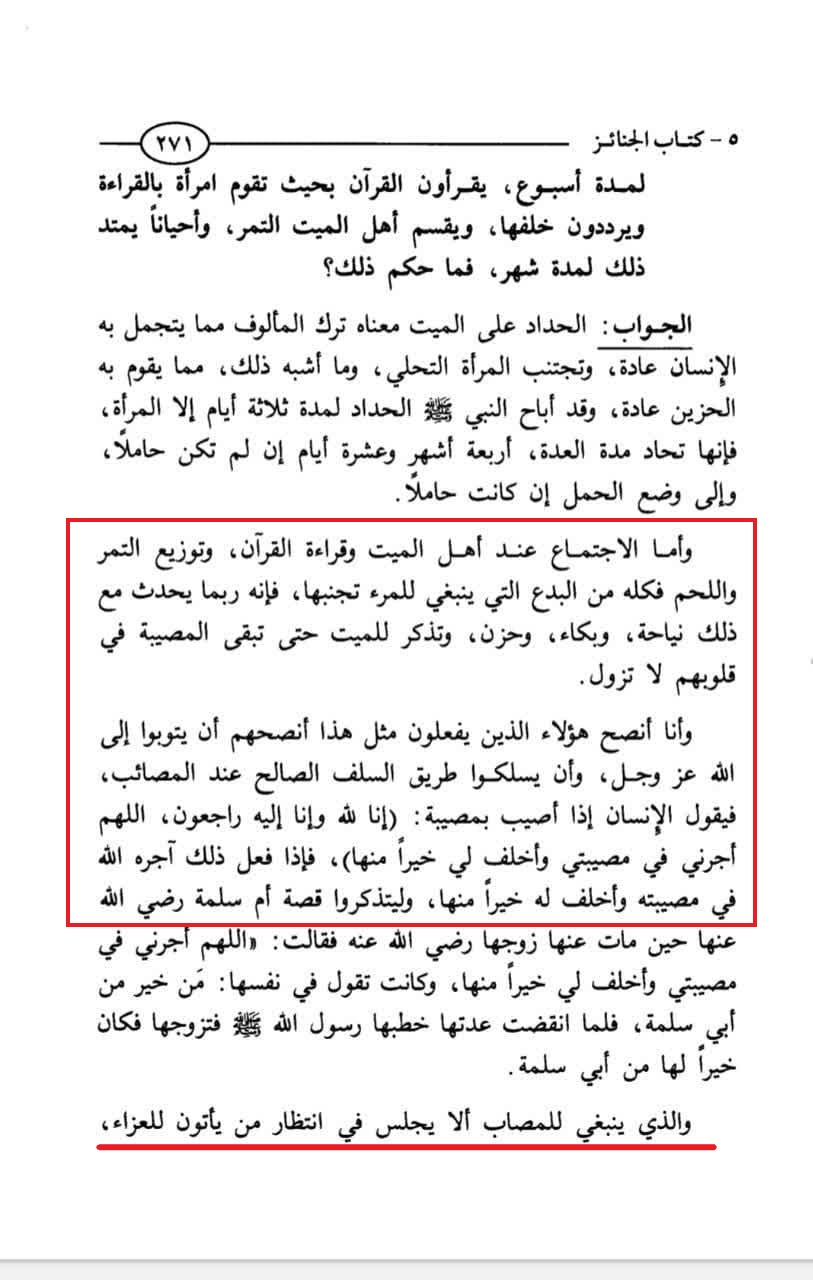 ”Adapun berkumpul bersama Ahli Mayyit (keluarga jenazah) dan membaca Al-Qur’an serta membagi-bagikan kurma dan daging semuanya itu bid’ah dan selayaknya seseorang menjauhinya. Karena sesungguhnya dengan hal-hal tersebut akan muncul ratapan, tangisan, kesedihan, dan ingatan tentang jenazah sehingga musibah itu akan selalu bersemayam di hati mereka dan tidak akan hilang.”