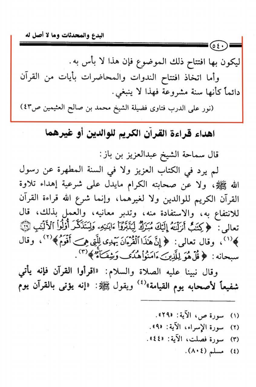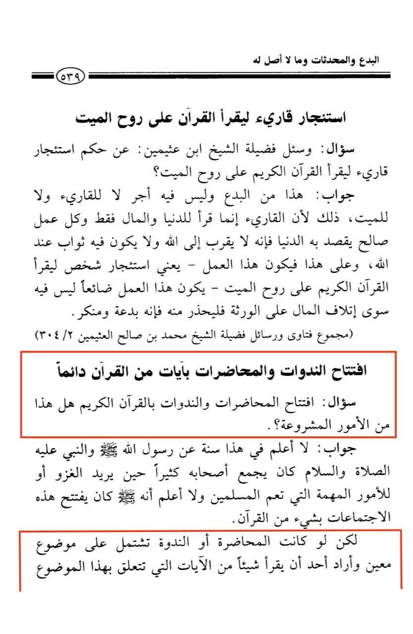 “Jika pidato atau ceramah dan seminar-seminar berisikan sebuah tema tertentu, dan seseorang hendak membaca sesuatu dari Al-Qur’an yang berkaitan dengan tema tersebut sebagai pembukaannya, maka hal ini tidak menjadi masalah. Akan tetapi, selalu membuka seminar-seminar dan pidato atau ceramah dengan ayat-ayat Al-Qur’an seolah-olah hal tersebut adalah sebuah sunnah yang disyariatkan dalam agama, maka hal ini tidak boleh.