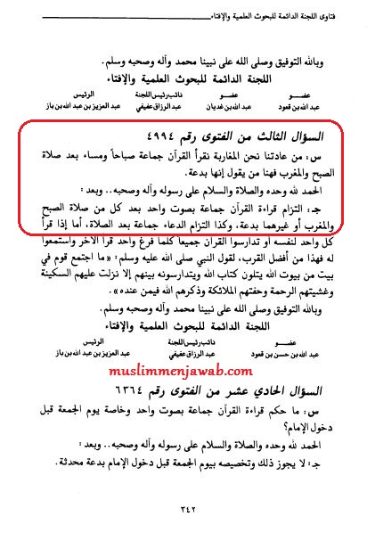 Jawab: Komitmen membaca Al-Quran bersama-sama dengan satu suara setelah setiap salat Subuh dan Magrib atau selain keduanya adalah bid’ah. begitu juga dengan berdoa bersama-sama setelah salat..[1]